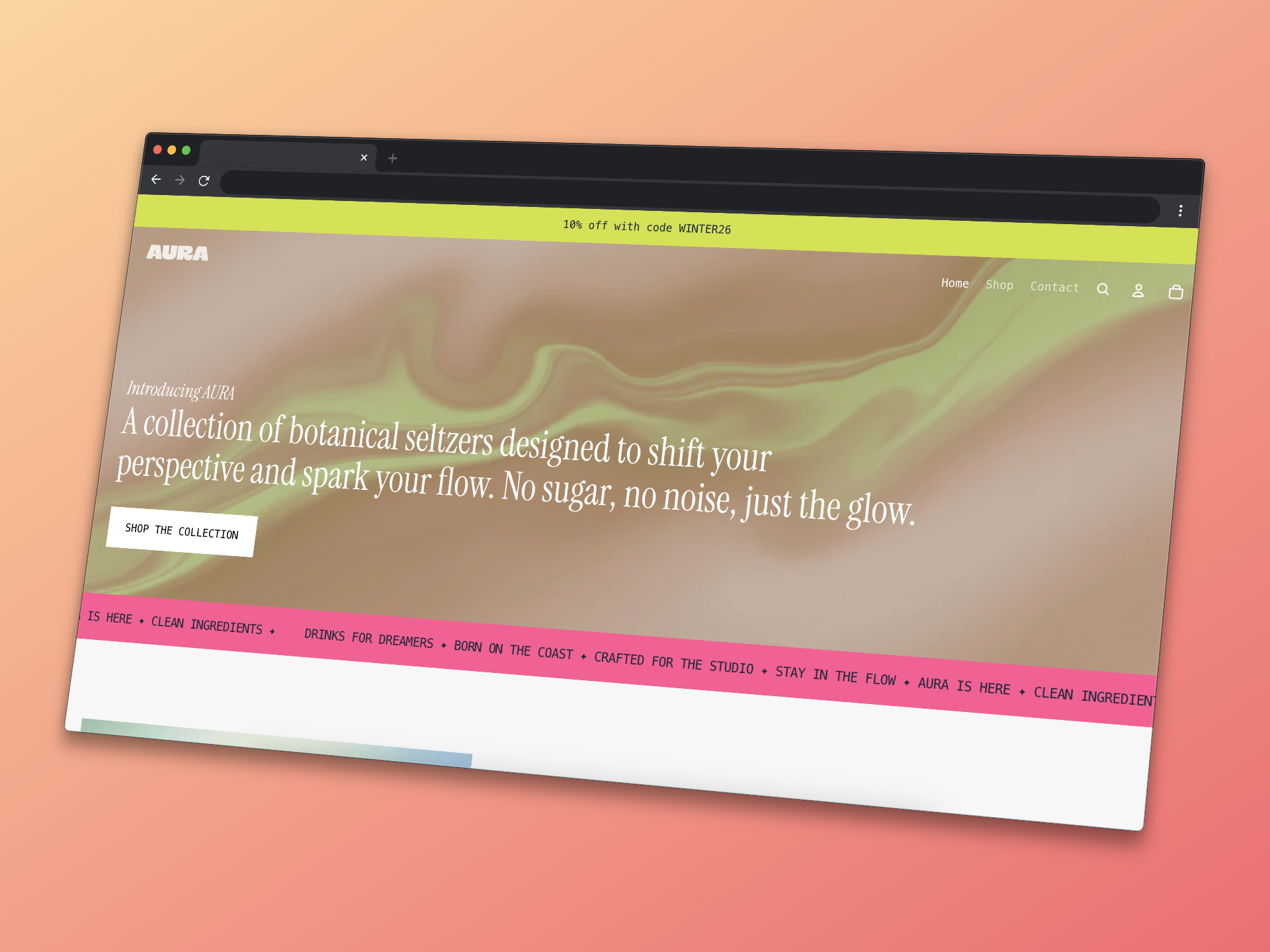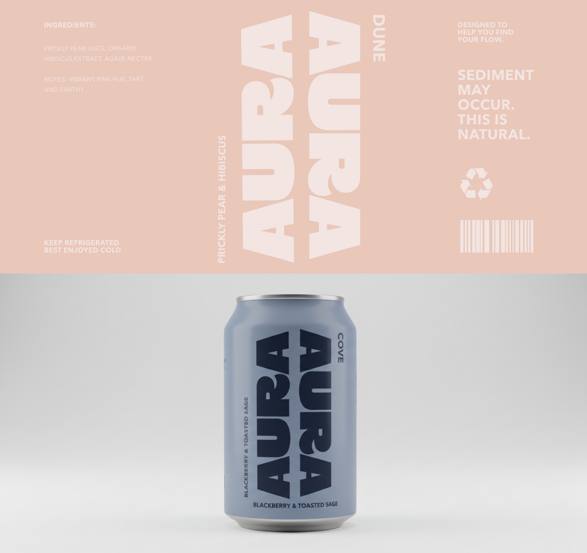 A self-initiated case study for a fictional botanical seltzer brand aimed at dreamers, creatives, and the studio-bound. AURA leans into the contrast between bold typographic structure and softer, more atmospheric color, with four flavor identities tied to coastal landscapes (Amber, Cove, Dune, Mist). Scope covered brand identity, packaging across the line, and a full Shopify storefront designed to feel like a mood board you can shop.